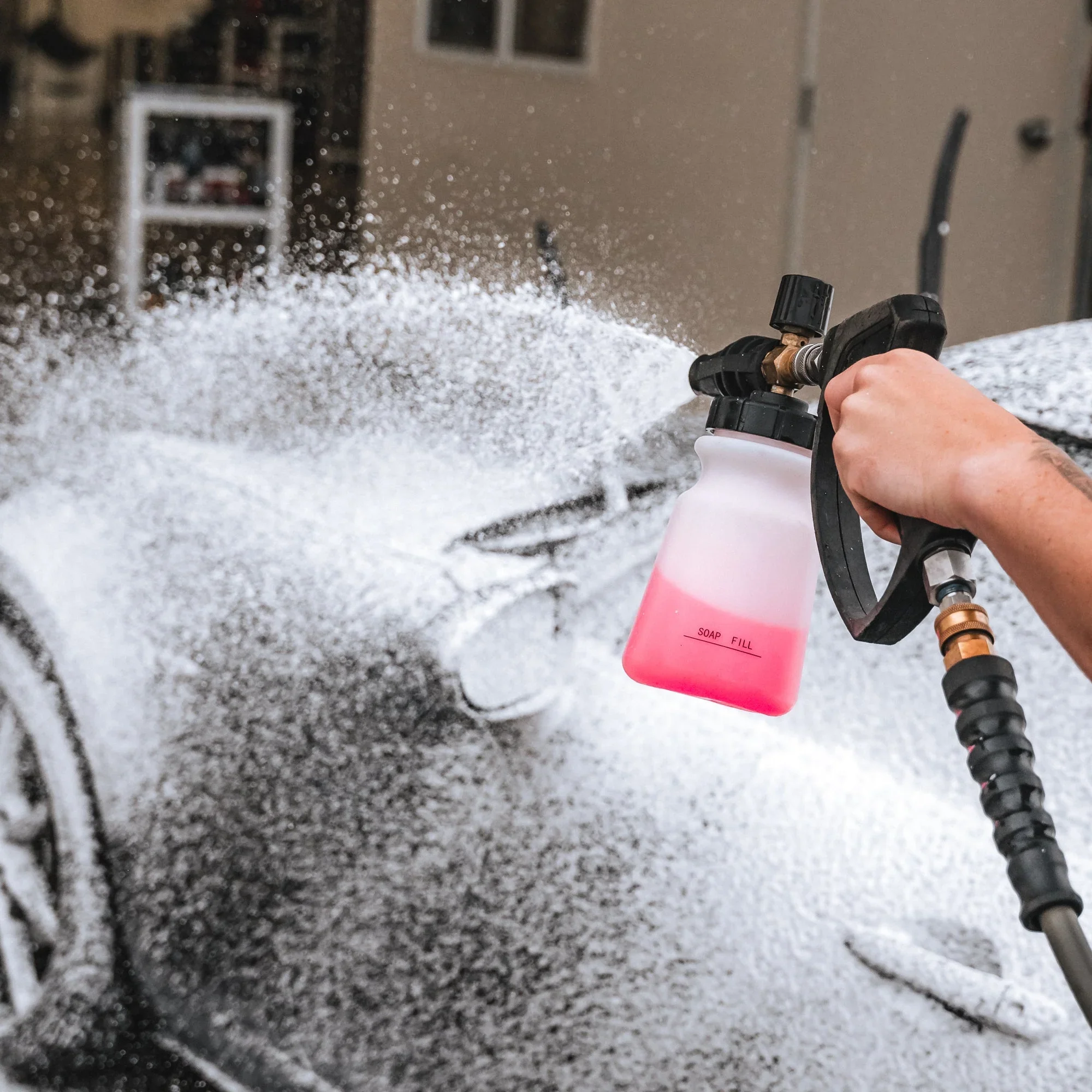 High-pressure pre-rinse and foam wash using a power washer